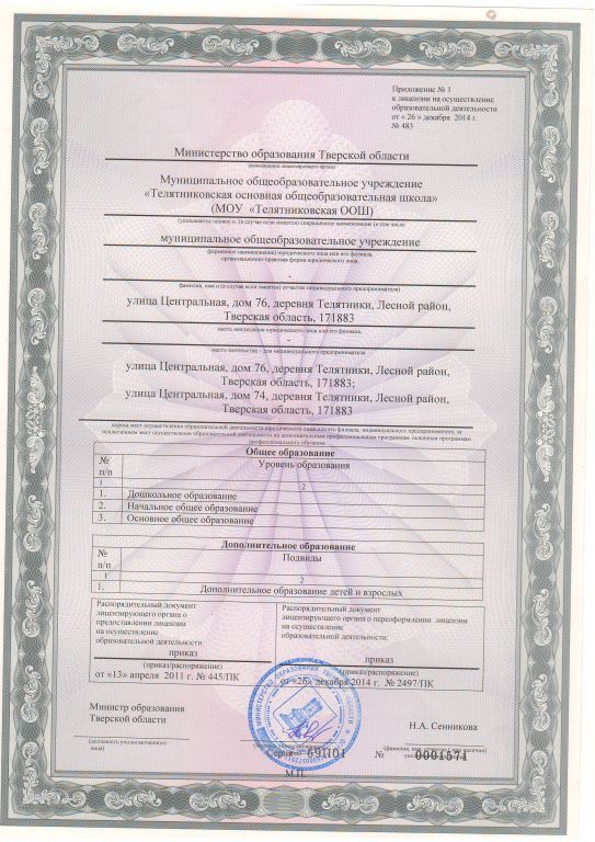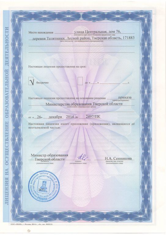 • Места осуществления образовательной деятельности по дополнительным образовательным программам: Тверская область Лесной район деревня Телятники улица Центральная дом 76,74