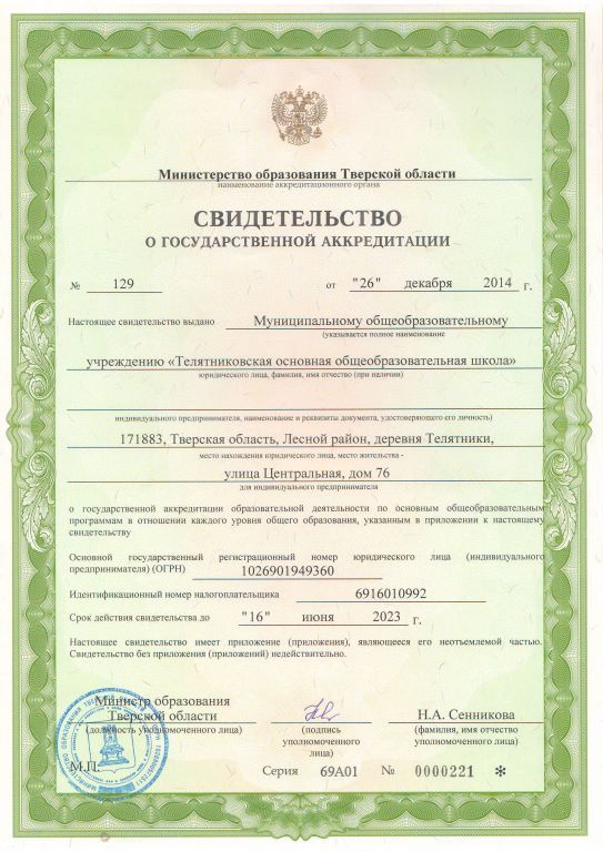 Адрес местонахождения образовательной организации* 171883, Тверская область, Лесной район, д. Телятники, улица Центральная, дом 76